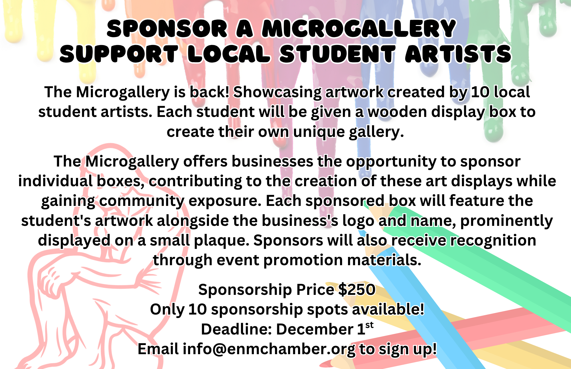 An amazing opportunity to support a young local artist. We will sign up 10 local student artists to create works of art that will fit into our 10 microgalleries. Then showcase the galleries at the Elko New Market Tree Lighting Ceremony on Dec 6th. Sponsoring a microgallery gives businesses the chance to put their logo next to the student's art for all to see.